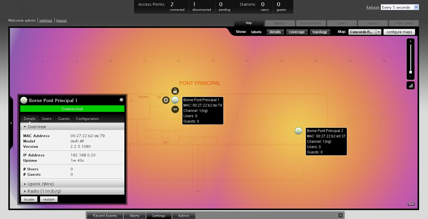 Les bornes ont été placées afin de couvrir en signal l’intégralité de l’établissement. Elles ont été reliées au routeur principal par boîtier CPL de sorte à garder toute la souplesse de mise en service sur ce type de prestation ponctuelle.